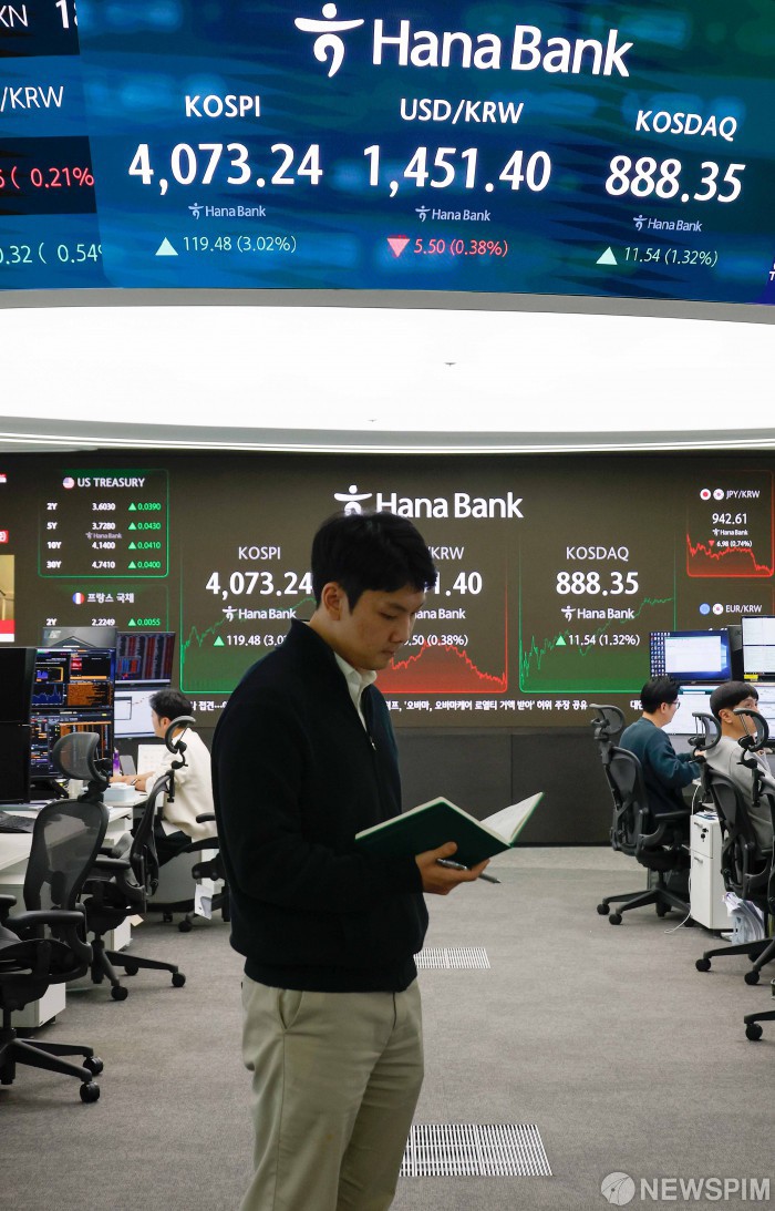 [서울=뉴스핌] 류기찬 기자 = 10일 오후 서울 중구 하나은행 딜링룸 전광판에 코스피, 달러/원, 코스닥 지수가 표시되고 있다. 이날 코스피 지수는 전 거래일 대비 119.48포인트(3.02%) 오른 4073.24에, 달러/원 환율은 5.50원 내린 1451.40원에, 코스닥 지수는 11.54포인트(1.32%) 오른 888.35에 장을 마감했다. 2025.11.10 ryuchan0925@newspim.com