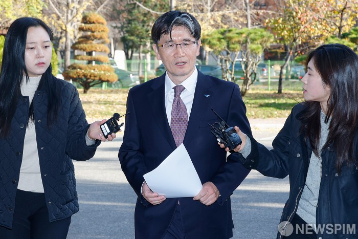 [과천=뉴스핌] 류기찬 기자 = 오동운 고위공직자범죄수사처장이 11일 오전 경기 과천시 정부과천청사 공수처로 출근하며 취재진의 질문에 답하고 있다. 2025.11.11 ryuchan0925@newspim.com