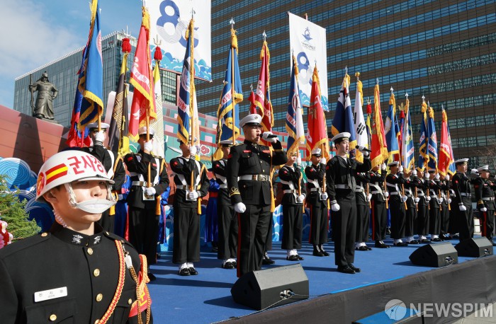 [서울=뉴스핌] 김학선 기자 = 제80주년 해군 창설 기념식이 열린 11일 서울 광화문 광장 이순신 장군 동상 앞에서 해군가가 울려퍼지고 있다. 2025.11.11 yooksa@newspim.com
