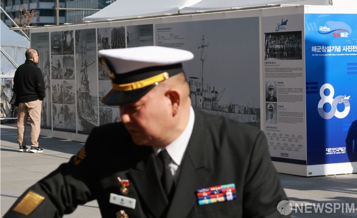 [서울=뉴스핌] 김학선 기자 = 제80주년 해군 창설 기념식이 열린 11일 서울 광화문 광장 이순신 장군 동상 앞에서 한 시민이 해군창설기념 사진전을 관람하고 있다. 2025.11.11 yooksa@newspim.com
