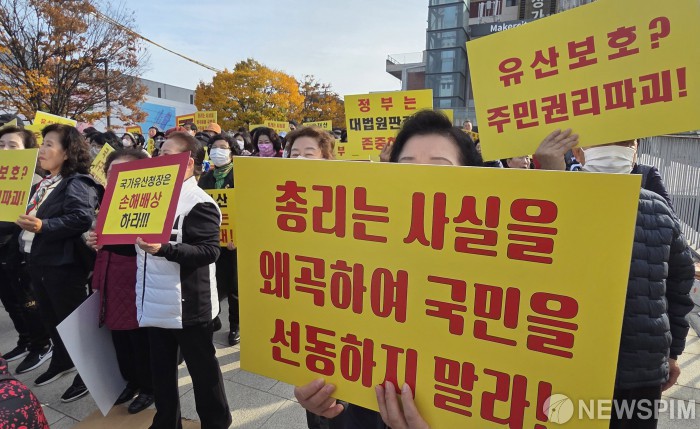 [서울=뉴스핌] 양윤모 기자 = 세운4구역 토지주들이 11일 오후 서울 종로구 종로3가 다시세운광장에서국가유산청이 유네스코 세계유산인 종묘 인근 세운4구역 재개발 사업에 문제를 제기한 데 대해 기자회견을 개최하고 있다. 세운4구역 토지주들은 "국가유산청이 재개발을 불가능하게 한다면 부당한 행정 행위에 대한 책임을 물어 손해배상·직권남용 등 민형사상의 책임을 물을 것"이라며 반발했다. 2025.11.11 yym58@newspim.com