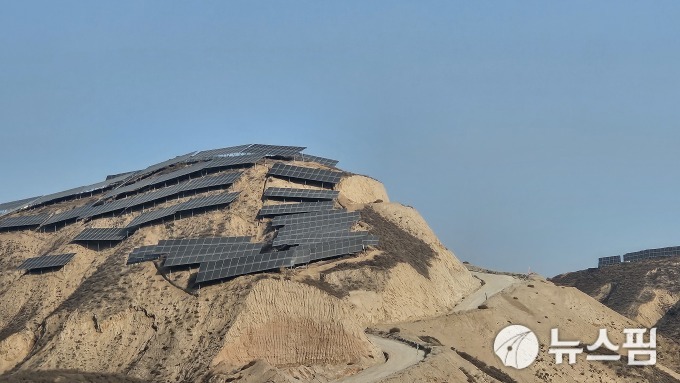 | [서울=뉴스핌] 최헌규 중국전문기자= 중국 간쑤성의 산위에 태양광 패널이 설치돼 있다. 사진= 뉴스핌 최헌규 기자 촬영. 2025.11.12 chk@newspim.com |