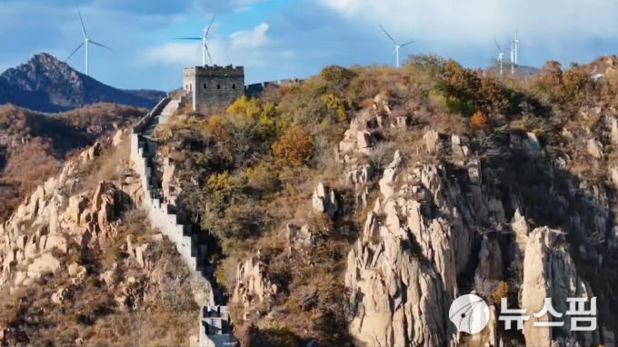 | [서울=뉴스핌] 최헌규 중국전문기자= 중국 허베이성 친황다오의 장성이 지나가는 산에 풍력발전 설비가 설치돼 있다. 사진= 뉴스핌 촬영. 2025.11.12 chk@newspim.com |
