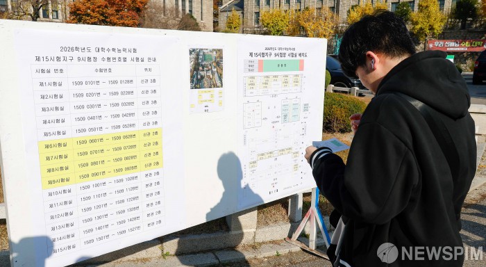 [서울=뉴스핌] 류기찬 기자 = 2026학년도 대학수학능력시험 예비소집일인 12일 오후 서울 종로구 중앙고등학교를 찾은 수험생이 배치표를 확인하고 있다. 2025.11.12 ryuchan0925@newspim.com