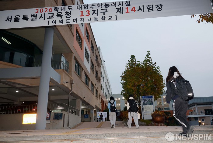 [서울=뉴스핌] 류기찬 기자 = 2026학년도 대학수학능력시험이 실시된 13일 오전 서울 영등포구 여의도여자고등학교에 마련된 시험장으로 수험생들이 들어서고 있다. 2025.11.13 ryuchan0925@newspim.com