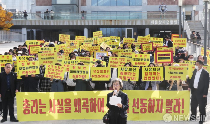 | [서울=뉴스핌] 양윤모 기자 = 세운4구역 토지주들이 11일 오후 서울 종로구 종로3가 다시세운광장에서국가유산청이 유네스코 세계유산인 종묘 인근 세운4구역 재개발 사업에 문제를 제기한 데 대해 기자회견을 개최하고 있다. 세운4구역 토지주들은 "국가유산청이 재개발을 불가능하게 한다면 부당한 행정 행위에 대한 책임을 물어 손해배상·직권남용 등 민형사상의 책임을 물을 것"이라며 반발했다. 2025.11.11 yym58@newspim.com |