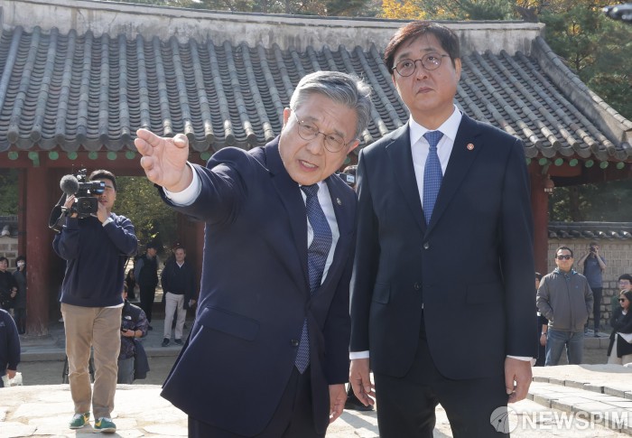 | [서울=뉴스핌] 양윤모 기자 = 최휘영 문화체육관광부 장관이 7일 오후 허민 국가유산청장의 안내로 종묘 앞 개발 관련상황을 확인하기 위해 종묘를 방문하고 있다. 대법원은 6일 서울시의 종묘 앞(세운4구역) 개발과 관련해 국가유산청(문체부)이 제기한 조례 무효 소송에서 문화유산 인근 규제를 완화한 조례 개정이 적법하다고 판결했다. 세운4구역 건물 최고 높이는 당초 종로변 55m, 청계천변 71.9m에서 종로변 101m, 청계천변 145m로 변경됐다. 2025.11.07 yym58@newspim.com |