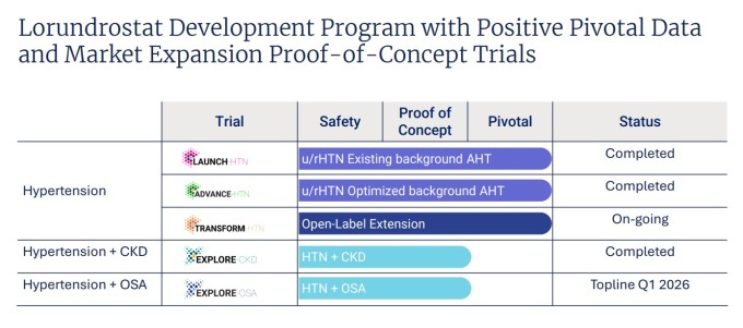 그는 이어 "로룬드로스타트가 고혈압과 관련된 동반 질환에서도 임상적 혜택을 줄 수 있는지를 계속 평가하고 있으며, 알도스테론 수치 정상화가 의미 있는 치료 효과로 이어질 수 있다"고 설명했다. 또한 "EXPLORE-CKD 2상 시험에서 긍정적인 주요 결과를 확보한 데 이어, EXPLORE-OSA 2상 시험에서도 성공적인 결과가 도출된다면, 로룬드로스타트의 치료 영역은 더욱 확대될 것"이라고 덧붙였다.