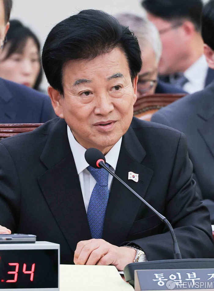 [서울=뉴스핌] 윤창빈 기자 = 정동영 통일부 장관이 14일 서울 여의도 국회에서 열린 외교통일위원회 전체회의에서 의원 질문에 답변하고 있다. 2025.11.14 pangbin@newspim.com