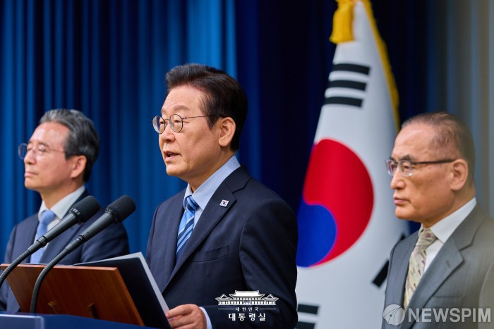 [서울=뉴스핌] 이재명 대통령이 14일 서울 용산 대통령실에서 한·미 팩트시트 타결 결과를 발표하고 있다. [사진=대통령실] 2025.11.14 photo@newspim.com