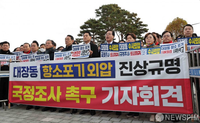 [서울=뉴스핌] 윤창빈 기자 = 송언석 국민의힘 원내대표가 17일 서울 용산구 전쟁기념관 앞에서 열린 대장동 항소포기 외압 진상규명을 위한 국정조사 촉구 기자회견에서 규탄사를 하고 있다. 2025.11.17 pangbin@newspim.com