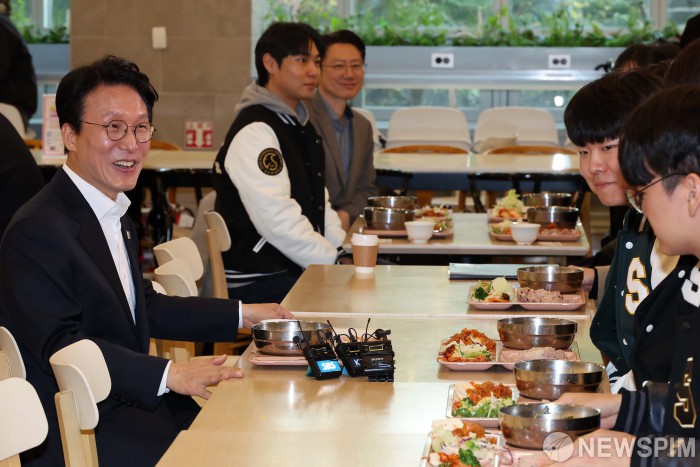 [서울=뉴스핌] 청사사진기자단 = 김민석 국무총리가 17일 '천원의 아침밥'을 제공하는 서울 종로구 성균관대학교 은행골식당을 찾아 학생들과 대화하며 식사를 하고 있다. 2025.11.17 photo@newspim.com