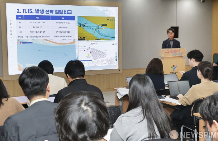 [서울=뉴스핌] 양윤모 기자 = 김선직 (주)한강버스 대표가 17일 오전 서울시청에서 한강버스 멈춤사고 관련 브리핑을 하고 있다. 15일 저녁 잠실선착장서 100m 떨어진 지점에서 승객 82명이 탑승한 102호 한강버스가 강바닥에 걸려 멈추는 사고가 발생해 잠실~압구정 구간 운행이 중단된 상태이며 19일 19시에 이동할 예정이다. 김민석 국무총리는 16일 사고 원인 규명과 안전 대책 점검을 지시했으며,오세훈 서울시장은 “승객 여러분께 불안과 불편을 끼쳐드려 송구하다”고 고개를 숙였다. 2025.11.17 yym58@newspim.com