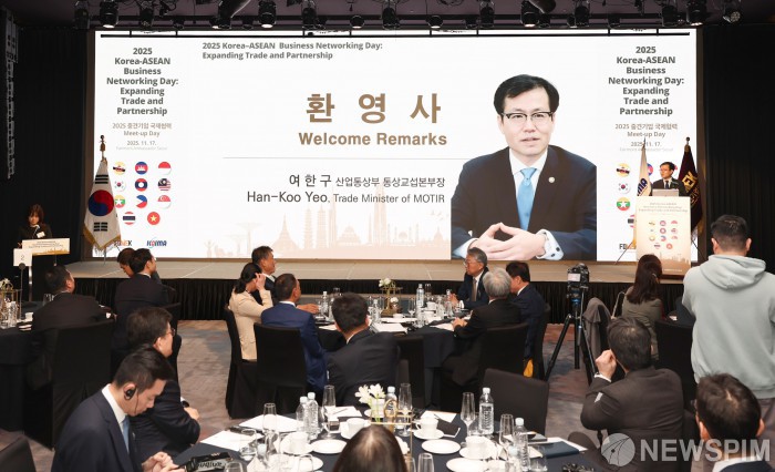 [서울=뉴스핌] 여한구 산업통상부 통상교섭본부장이 17일 서울 영등포구 페어몬트 앰배서더 서울에서 열린 2025년 중견기업 국제협력 밋 업 데이(Meet-up Day)에서 환영사를 하고 있다. [사진=산업통상부] 2025.11.17 photo@newspim.com