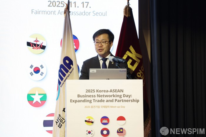 [서울=뉴스핌] 여한구 산업통상부 통상교섭본부장이 17일 서울 영등포구 페어몬트 앰배서더 서울에서 열린 2025년 중견기업 국제협력 밋 업 데이(Meet-up Day)에서 환영사를 하고 있다. [사진=산업통상부] 2025.11.17 photo@newspim.com