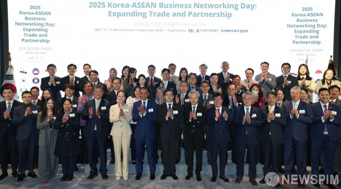 [서울=뉴스핌] 여한구 산업통상부 통상교섭본부장이 17일 서울 영등포구 페어몬트 앰배서더 서울에서 열린 2025년 중견기업 국제협력 밋 업 데이(Meet-up Day)에서 최진식 중견기업연합회 회장, 다토 모하메드 잠루니 빈 카리 주한 말레이시아 대사 등 참석자들과 기념촬영을 하고 있다. [사진=산업통상부] 2025.11.17 photo@newspim.com