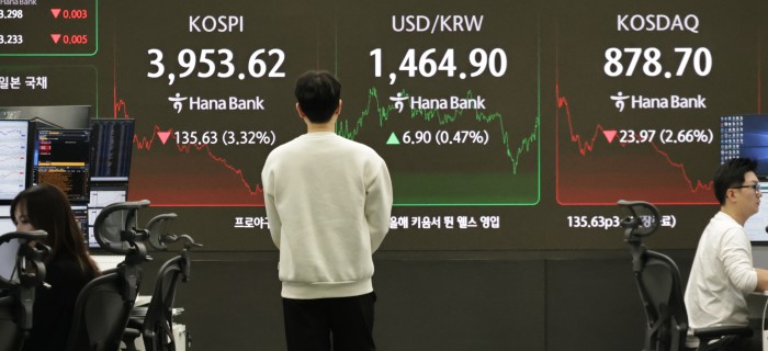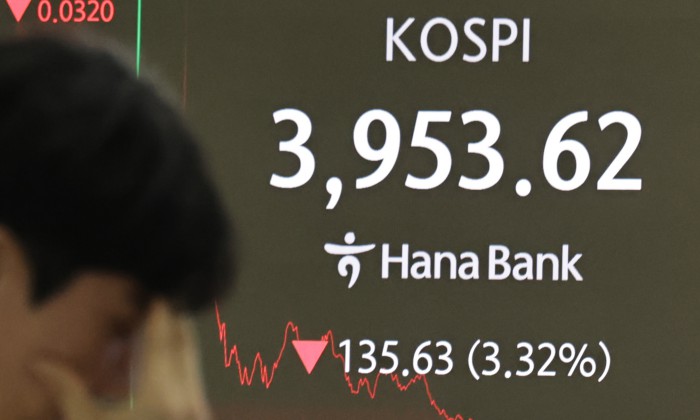 이날 한국거래소에 따르면 코스피 지수는 전 거래일보다 135.63포인트(3.32%) 내린 3953.62에 마감했다. 외국인과 기관이 각각 7811억원, 7168억원 팔아치웠으며 개인은 1조4824억원을 사들였다. 코스피는 4044.47에서 출발해 개장 직후 4072.41까지 반등을 시도했으나, 이후 낙폭을 지속적으로 확대하며 오후 들어 3960선 아래로 밀렸다.