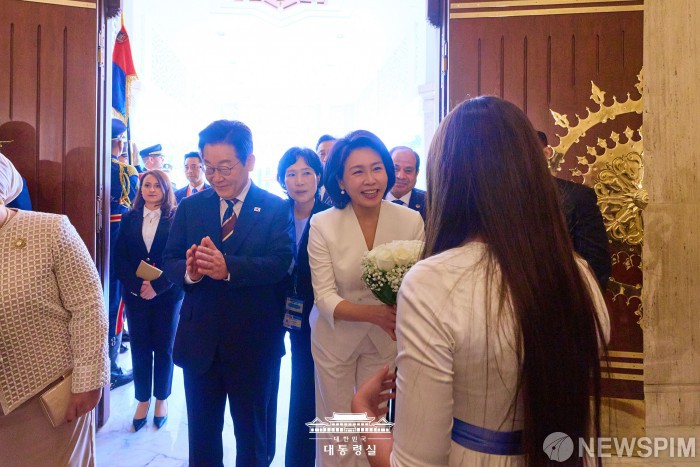 [서울=뉴스핌] 이집트를 공식 방문 중인 이재명 대통령과 김혜경 여사가 지난 20일(현지시간) 카이로 대통령궁에 들어서며 인사를 나누고 있다. [사진=대통령실] 2025.11.21 photo@newspim.com