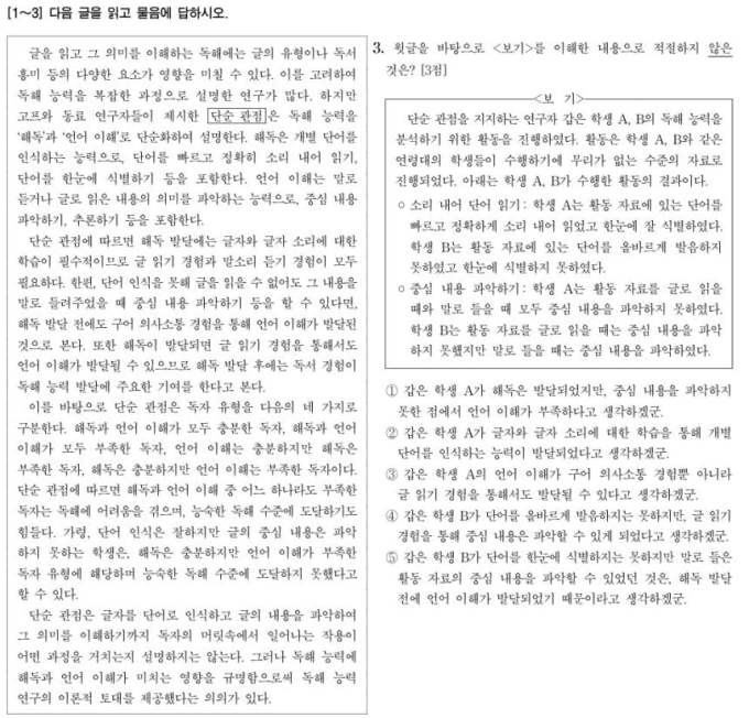 이 교수는 해당 이론의 잘못된 소개가 3번 문항 판단에도 직접적인 영향을 미친다고 지적했다. 문항은 학생 A와 B의 읽기·듣기 특징을 제시한 뒤 '적절하지 않은 진술'을 고르도록 했는데, 이 교수는 "A는 해독은 가능하나 듣기 이해가 부족한 학생이고, B는 듣기 이해는 되지만 해독 능력이 거의 없는 미취학 수준에 가까운 유형"이라고 설명했다.