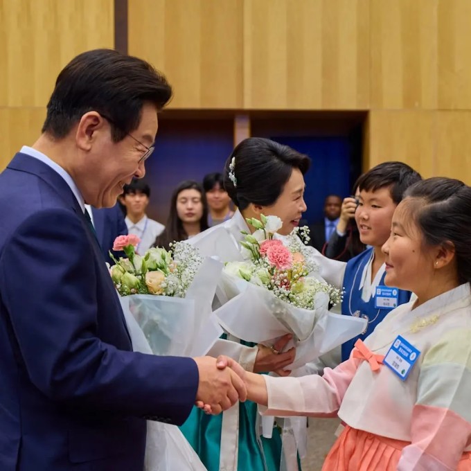 | 이재명 대통령이 23일(현지시간) 남아프리카공화국 요하네스버그 샌튼 컨벤션센터에서 열린 동포 오찬 간담회에서 화동들로부터 꽃다발을 받고 있다. [사진=KTV] |