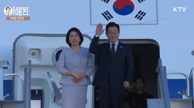 이재명 대통령과 김혜경 여사가 23일(현지시간) 남아프리카공화국에서 주요 20개국(G20) 정상회의 참석 일정을 모두 마무리하고 다음 순방국인 튀르키예로 출발하기 위해 전용기에 올라 인사하고 있다. [사진=KTV]