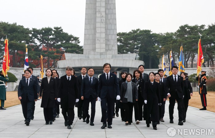 [서울=뉴스핌] 최지환 기자 = 신임 대표로 선출된 조국 조국혁신당 대표가 24일 오전 서울 동작구 국립서울현충원을 찾아 참배를 마친 뒤 이동하고 있다. 2025.11.24 choipix16@newspim.com