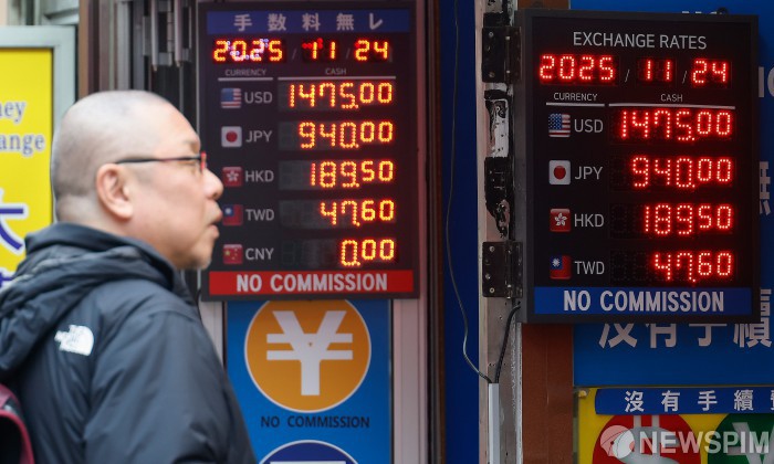 [서울=뉴스핌] 류기찬 기자 = 달러/원 환율이 1470원을 돌파한 24일 오후 서울 중구 명동 환전소에 달러/원 환전 시세가 표시되고 있다. 2025.11.24 ryuchan0925@newspim.com