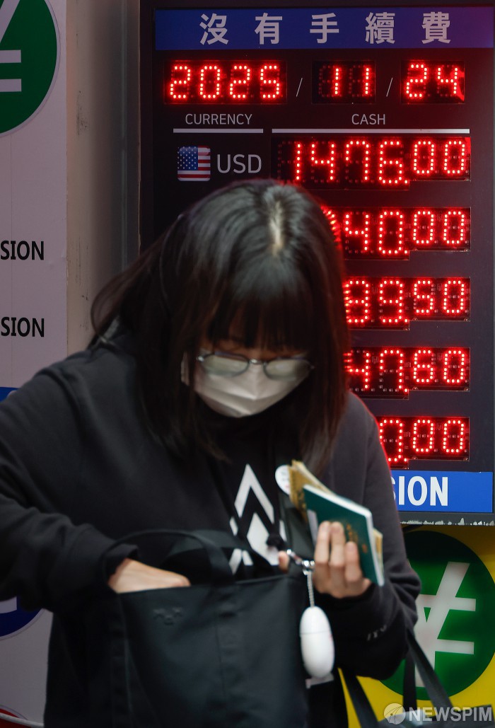 [서울=뉴스핌] 류기찬 기자 = 달러/원 환율이 1470원을 돌파한 24일 오후 서울 중구 명동 환전소에 달러/원 환전 시세가 표시되고 있다. 2025.11.24 ryuchan0925@newspim.com