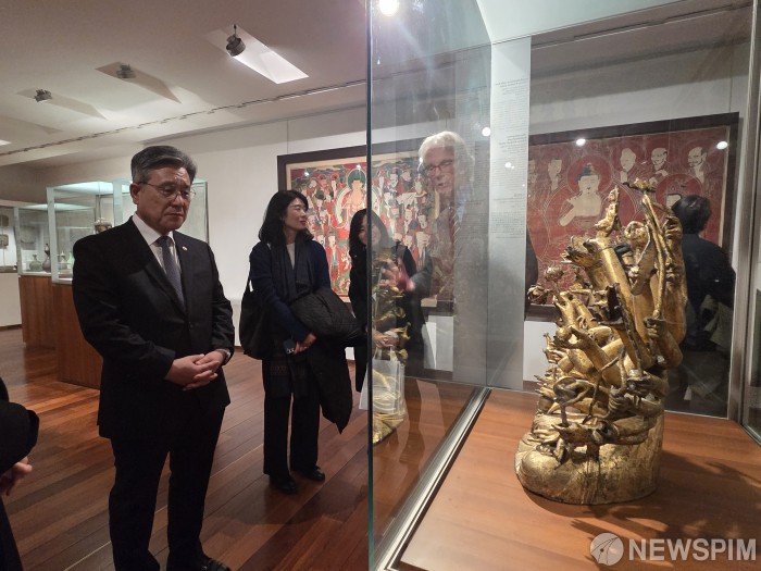 [서울=뉴스핌] 허민 국가유산청장이 23일(현지시간) 프랑스 파리 소재의 국립기메아시아예술박물관을 방문해 박물관 소장 한국 문화유산인 '금동천수관음보살좌상'을 살펴보고 있다. [사진=국가유산청] 2025.11.24 photo@newspim.com