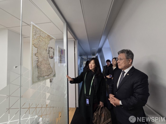 [서울=뉴스핌] 허민 국가유산청장이 23일(현지시간) 프랑스 파리 소재의 국립기메아시아예술박물관을 방문해 피에르 바티스트 소장품 및 보존관리부장과 내부를 관람하고 문화유산 분야의 협력 현황에 대해 환담한 뒤 기념촬영을 하고 있다. [사진=국가유산청] 2025.11.24 photo@newspim.com
