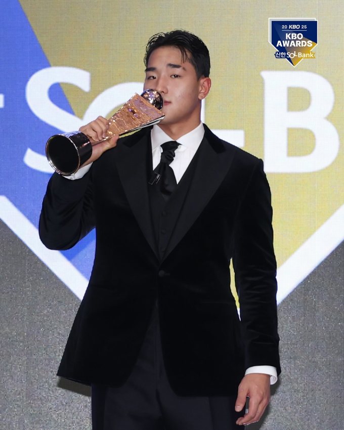 | [서울=뉴스핌] 장환수 스포츠전문기자= kt 안현민이 24일 KBO 시상식에서 신인왕 트로피에 입을 맞추고 있다. [사진=KBO] 2025.11.24 zangpabo@newspim.com |