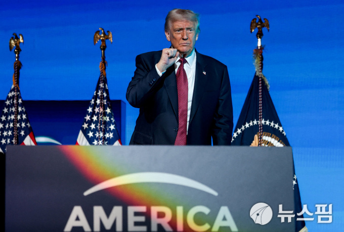 | 2025년 11월 5일, 미국 플로리다주 마이애미 카세야 센터 아레나에서 열린 아메리칸 비즈니스 포럼에서 도널드 트럼프 미국 대통령이 주먹을 들어보이고 있다.[사진=로이터 뉴스핌] |