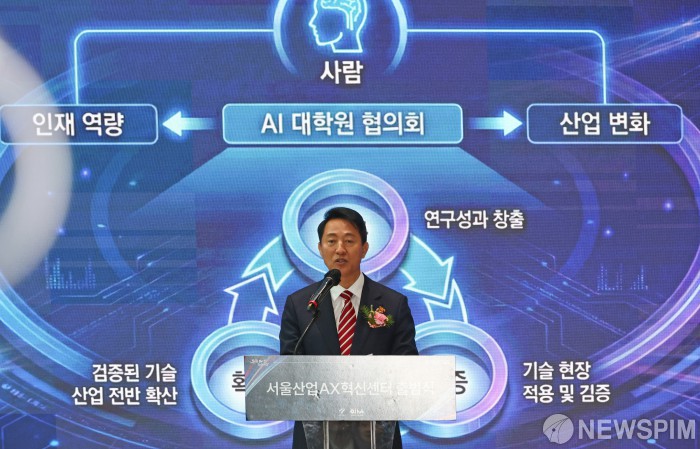[서울=뉴스핌] 최지환 기자 = 오세훈 서울시장이 25일 오후 서울 서초구 서울 AI허브 메인센터에서 열린 서울산업AX혁신센터 출범식에서 축사를 하고 있다. 2025.11.25 choipix16@newspim.com