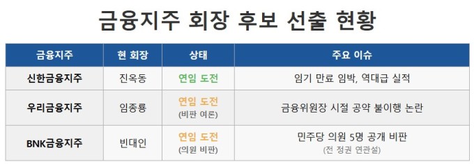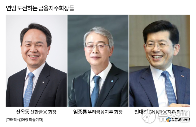 금융지주들의 역대급 실적에 힘입어 진행되고 있는 금융지주들의 회장 후보 선출 과정에서는 기존 회장이 유리하다는 분석이 나오고 있다. 진옥동 신한금융지주 회장, 임종룡 우리금융지주 회장, 빈대인 BNK금융지주 회장 후보는 모두 연임에 도전 중이다.