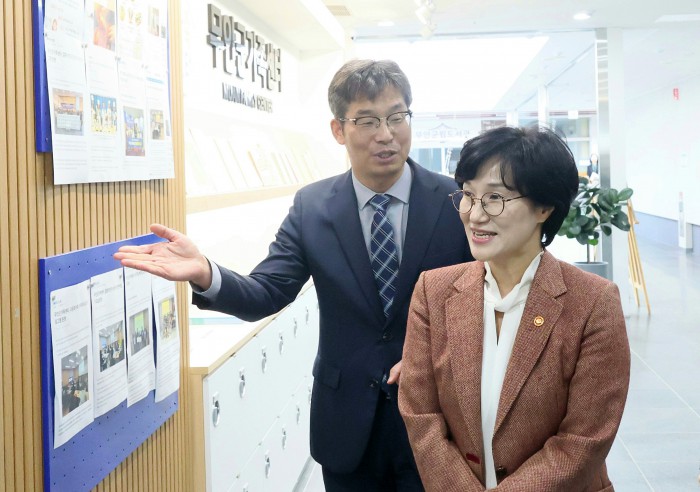 [서울=뉴스핌] 원민경 성평등가족부 장관이 24일 전남 무안군 가족센터를 방문해 정준수 무안군가족센터장의 안내를 받으며 공동육아나눔터와 다문화가족 한국어교육 등이 진행되는 시설을 둘러보고 있다. [사진=성평등가족부] 2025.11.24 photo@newspim.com