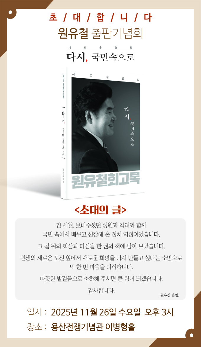 26일 정치권에 따르면 원유철 대표는 이날 오후 3시 용산 전쟁기념관에서 '다시, 국민속으로' 출간 기념회를 연다. 장동혁 국민의힘 대표와 김문수 전 국민의힘 대통령 후보, 오세훈 서울시장, 나경원 국민의힘 국회의원뿐만 아니라 서청원·이인제·황우여 등 원로 정치인이 출간 기념회에 참석하거나 동영상으로 축사를 할 예정이다.