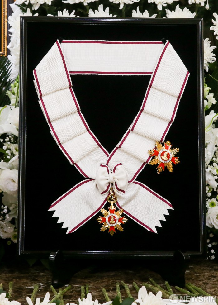 [서울=뉴스핌] 사진공동취재단 = 26일 서울 송파구 풍납동 서울아산병원 장례식장에 마련된 고(故) 이순재의 빈소에 금관문화훈장(1등급)이 놓여져 있다. 정부는 지난 25일 문화예술 발전과 국민 문화 향유에 기여한 공적을 기려 금관문화훈장(1등급)을 추서했다. 2025.11.26 photo@newspim.com