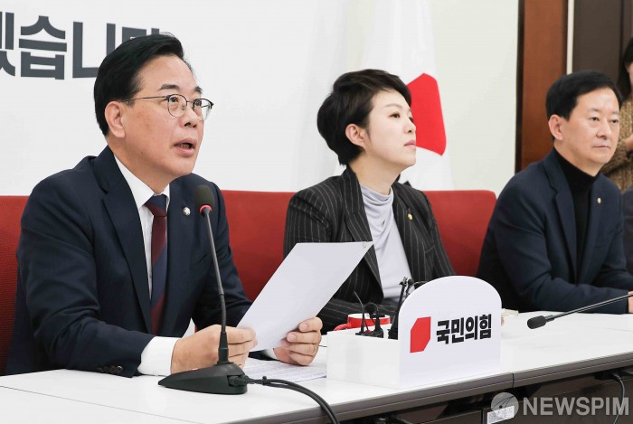 [서울=뉴스핌] 윤창빈 기자 = 송언석 국민의힘 원내대표가 26일 서울 여의도 국회에서 열린 현안 관련 긴급 기자간담회에서 발언하고 있다. 2025.11.26 pangbin@newspim.com