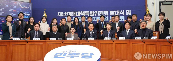 [서울=뉴스핌] 윤창빈 기자 = 정청래 더불어민주당 대표, 윤건영 위원장 등 참석자들이 26일 서울 여의도 국회에서 열린 재난재해대책특별위원회 발대식 및 재난재해 대응매뉴얼 발표회에서 기념촬영을 하고 있다. 2025.11.26 pangbin@newspim.com