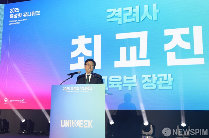 | [서울=뉴스핌] 최교진 교육부 장관이 21일 경기 고양시 킨텍스에서 열린 2025 특성화 유니위크 폐회식에서 격려사를 하고 있다. [사진=교육부] 2025.11.21 photo@newspim.com |