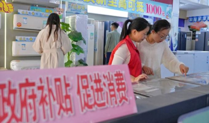 | [사진 신화사 = 뉴스핌 특약] 중국 내 한 가전 매장에 '정부 보조금으로 소비 진작'이라는 문구의 팻말이 전시돼 있다. |