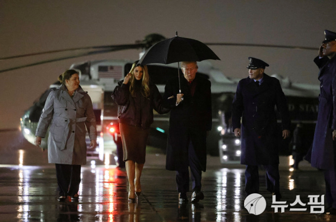2025년 11월 25일 미국 메릴랜드주 앤드루스 합동기지에서 도널드 트럼프 미국 대통령과 멜라니아 트럼프 여사가 플로리다주 팜비치로 향하기 위해 에어포스원을 타러 걸어가고 있다. [사진=로이터 뉴스핌]