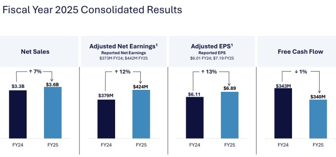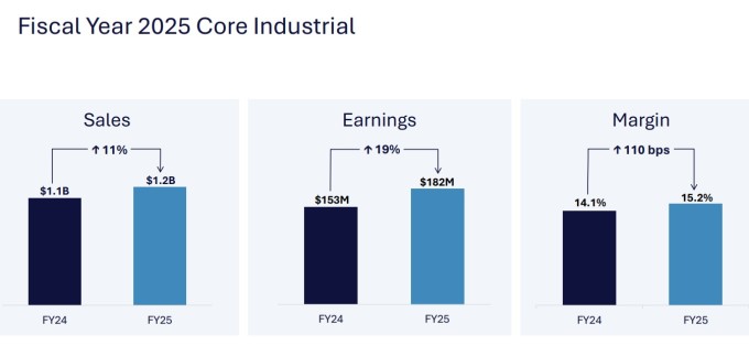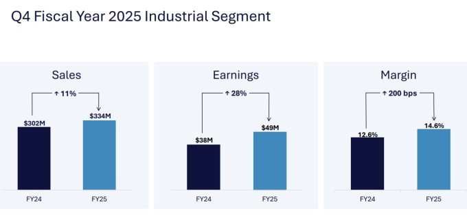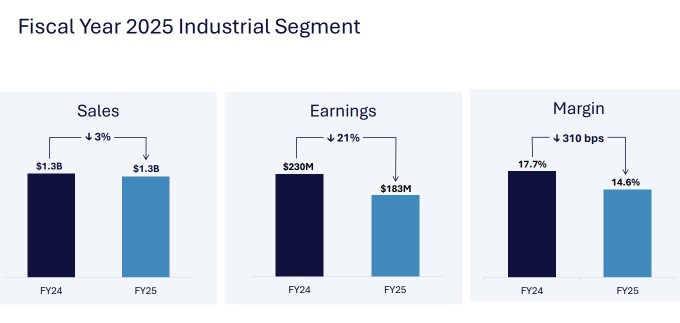 산업 부문은 항공우주 부문에 비해 다소 복잡한 양상을 보였다. 중국 경제의 어려움으로 중국 대형 트럭 엔진 부품 판매가 둔화하면서 2025 회계연도 전체 산업 부문 매출은 13억 달러로 전년 대비 3% 감소했고, 부문 이익은 1억8300만 달러로 21% 감소했다. 영업 이익률은 14.6%로 전년 대비 310bp 축소됐다.