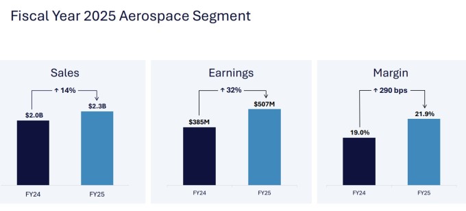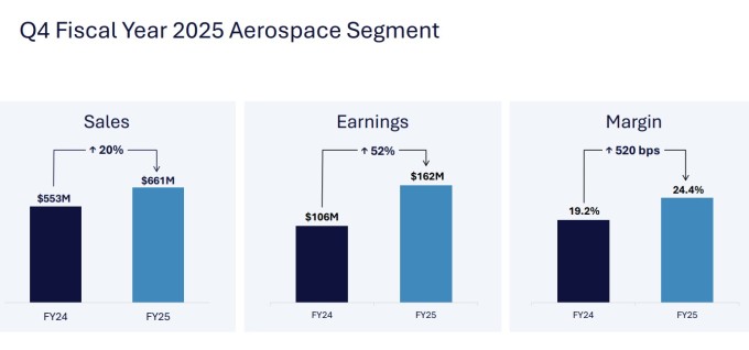 2025 회계연도 전체로는 항공우주 부문 매출이 23억 달러로 14% 증가했고, 부문 이익은 5억700만 달러로 32% 급증했다. 부문 영업 이익률은 21.9%로 전년 대비 290bp 상승하며 회사의 핵심 성장 동력으로 확고히 자리매김했다.