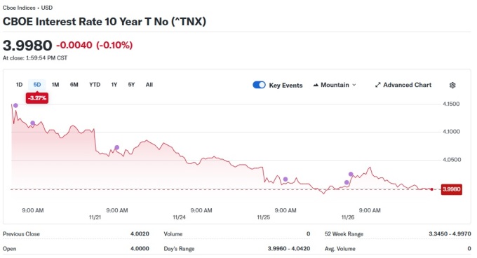 | 미 국채 10년물 금리 차트, 자료=야후 파이낸스, 2025.11.27 koinwon@newspim.com |