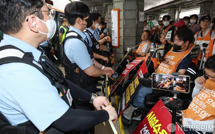 전장연은 전날에도 같은 시간대 시위를 벌여 지하철 5호선 열차가 여의나루역을 무정차 통과한 바 있다.
