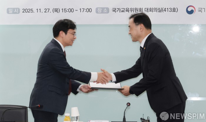 [서울=뉴스핌] 이길동 기자 =차정인 국가교육위원회 위원장이 27일 서울 종로구 정부서울청사에서 열린 국가교육위 학교공동체 회복 특별위원회 위촉식 및 1차 회의에서 김용 학교공동체 회복 특별위원회 위원장에게 위촉장 전달하고 있다.2025.11.27 gdlee@newspim.com