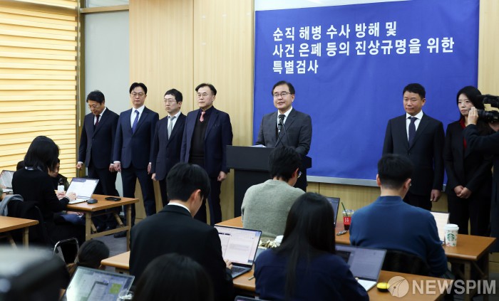 [서울=뉴스핌] 최지환 기자 = 채상병 순직 사건 외압·은폐 의혹을 수사해온 이명현 순직해병 특별검사가 28일 오전 서울 서초구 해병특검 사무실에서 열린 정례 브리핑에서 최종 수사 결과를 발표하고 있다. 2025.11.28 choipix16@newspim.com