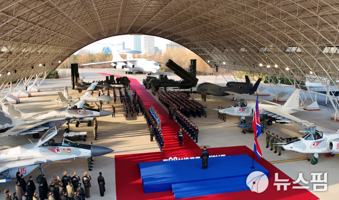 [서울=뉴스핌] 김정은 북한 국무위원장이 지난 11월 28일 강원도 원산 갈마비행장에서 열린 공군 창설 80주년 행사에 참석해 연설하고 있다. 미그-29와 수호이-35 전투기와 일류신(IL)-76 수송기를 개조한 공중조기경보통제기(맨 뒤편) 등이 보인다. [사진=노동신문 홈페이지] 2025.12.01