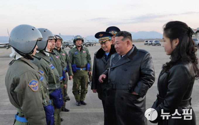 [서울=뉴스핌] 이영종 통일전문기자 = 공군 창설 80주년 행사에 참석한 김정은 북한 국무위원장이 11월 28일 강원도 원산 갈마비행장에서 여군 조종사들과 만나고 있다. 오른쪽은 딸 김주애. [사진=노동신문 홈페이지] 2025.12.01